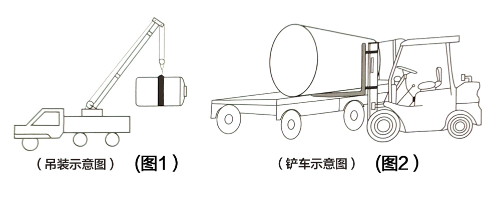 2、卸貨或吊裝產(chǎn)品時(shí),嚴(yán)禁用水箱上配置的接口或法蘭作為受力點(diǎn),正確的卸貨方式如下:(圖1-圖2);