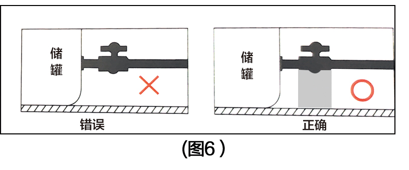 7、出口配管牙部要纏繞生料帶方可旋緊球閥或膠管,球閥下部需設(shè)置支架臺(tái),以防球閥處因負(fù)荷過重而致槽壁生裂痕。(圖6)