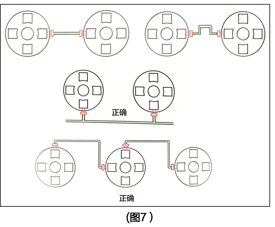 9、儲(chǔ)罐的連接,請勿于兩桶間直線連接,須以一彎角迂回對接,以免裝水后產(chǎn)生的壓力,使罐壁垂直度變化或膨脹,導(dǎo)致接頭連接受損產(chǎn)品泄露,甚至影響接頭和罐體的壽命。(圖7)